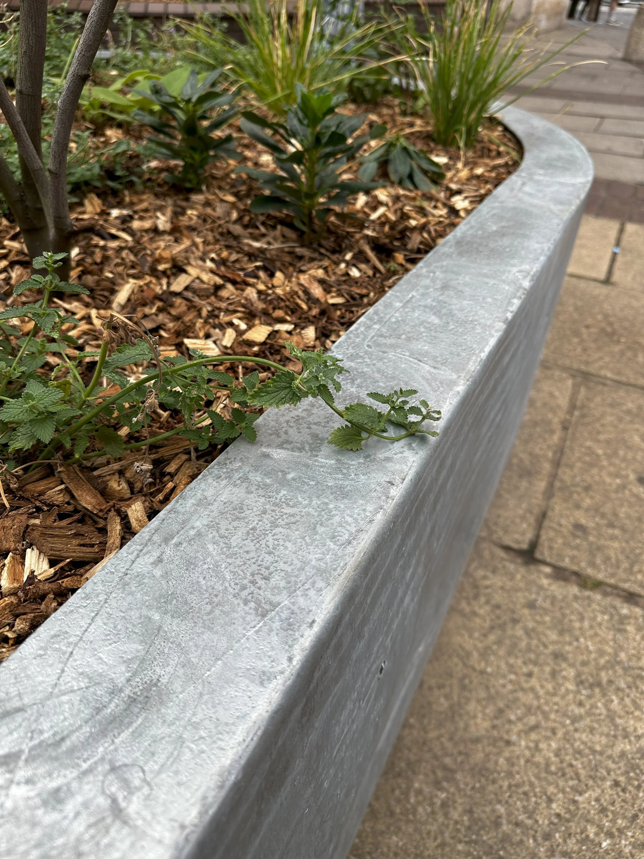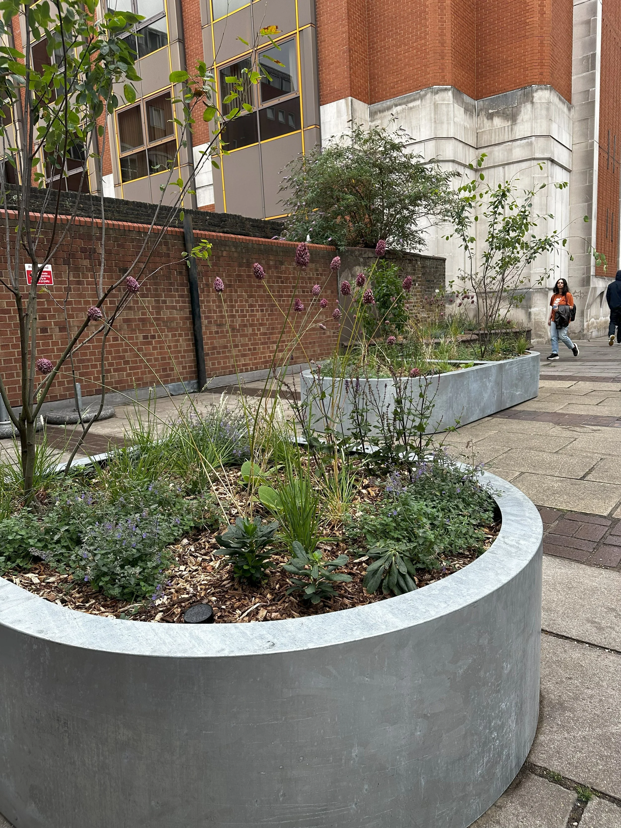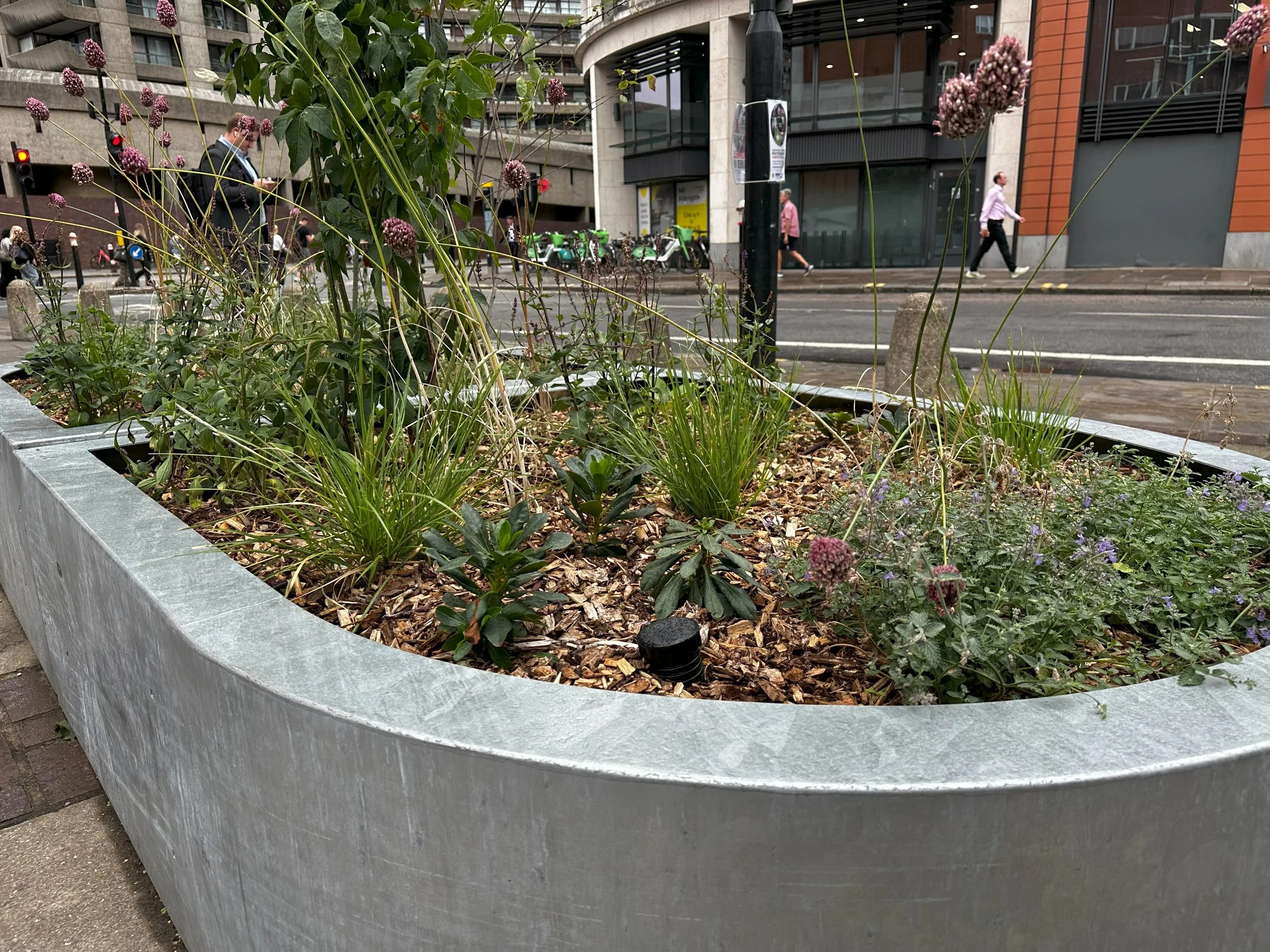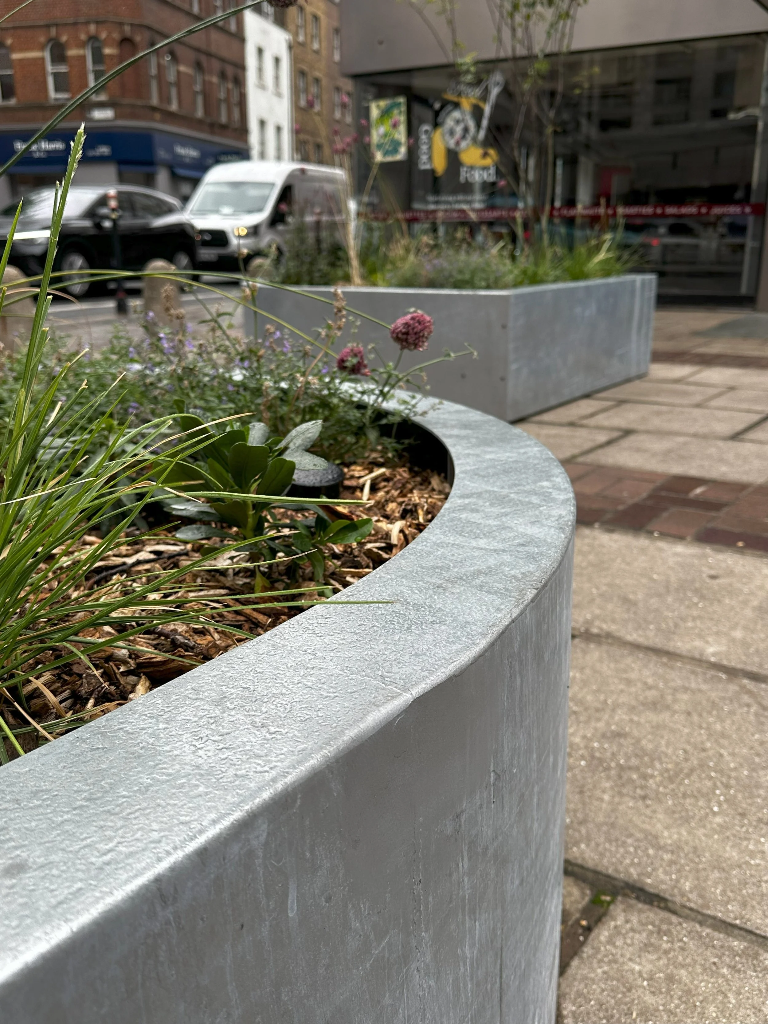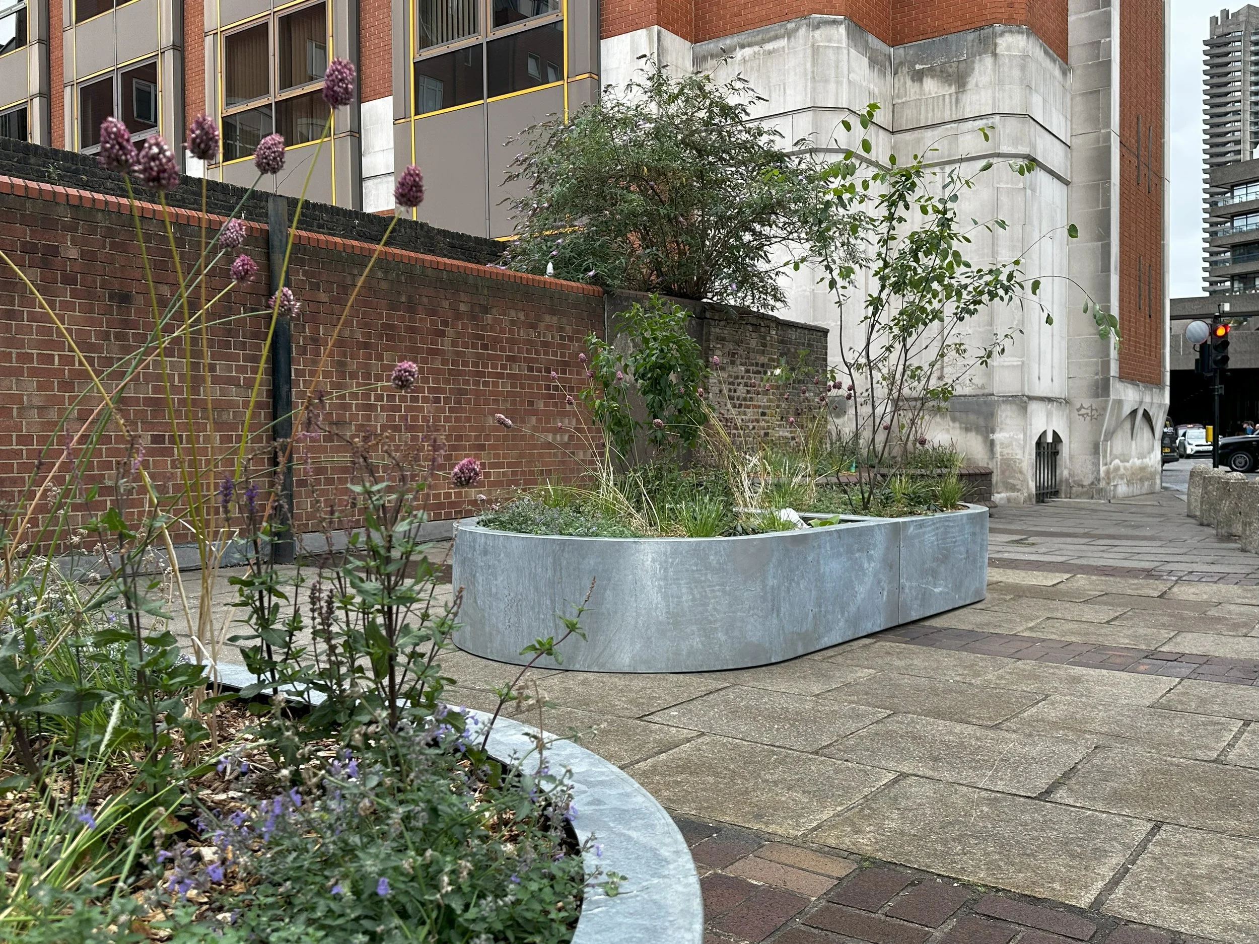 Bespoke hot dipped galvanised street planters with integral seating in this public space within the City of London close to the Barbican Centre.