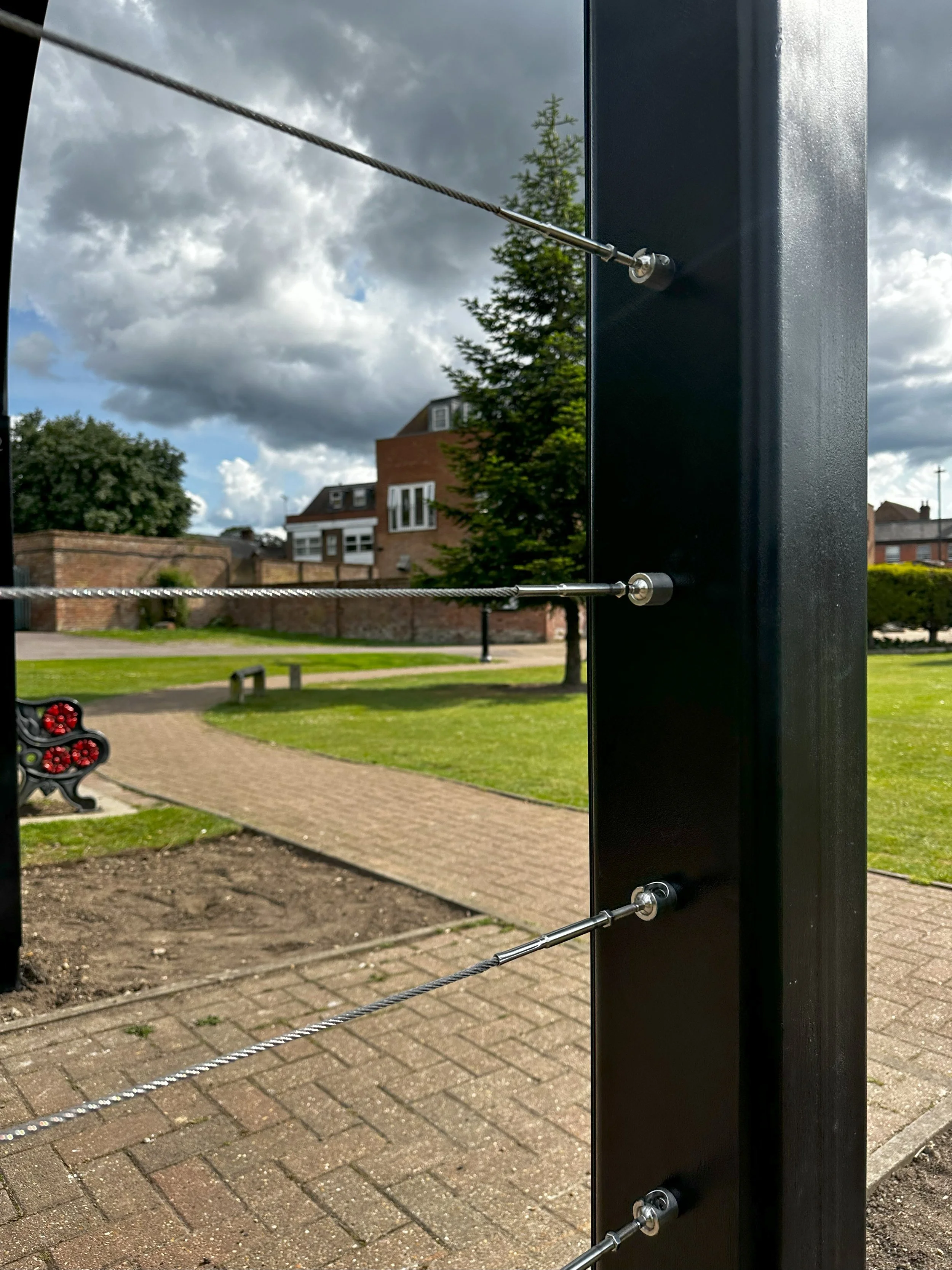 This was achieved using lettering laser cut into powder coated angles with contrasting stainless steel plates behind. Measuring 12m long, it featured 7 curved arches with stainless steel tensioned cables between.