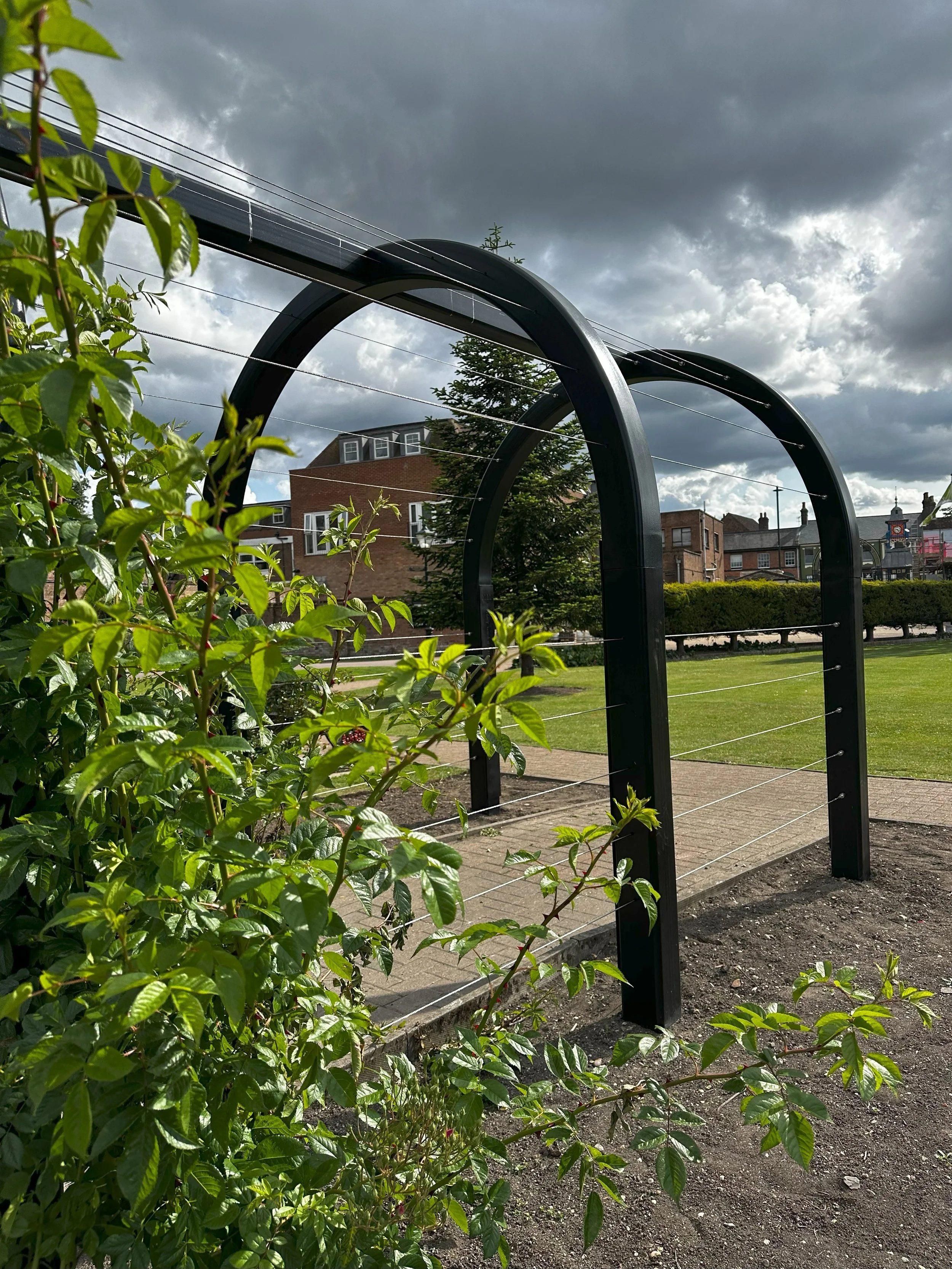 The design and fabrication of this bespoke pergola structure for the historic Priory Gardens in Dunstable, Bedfordshire.
