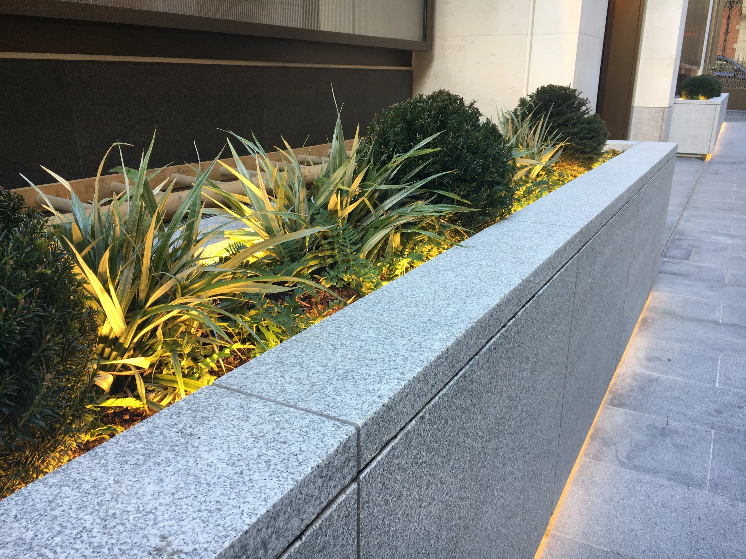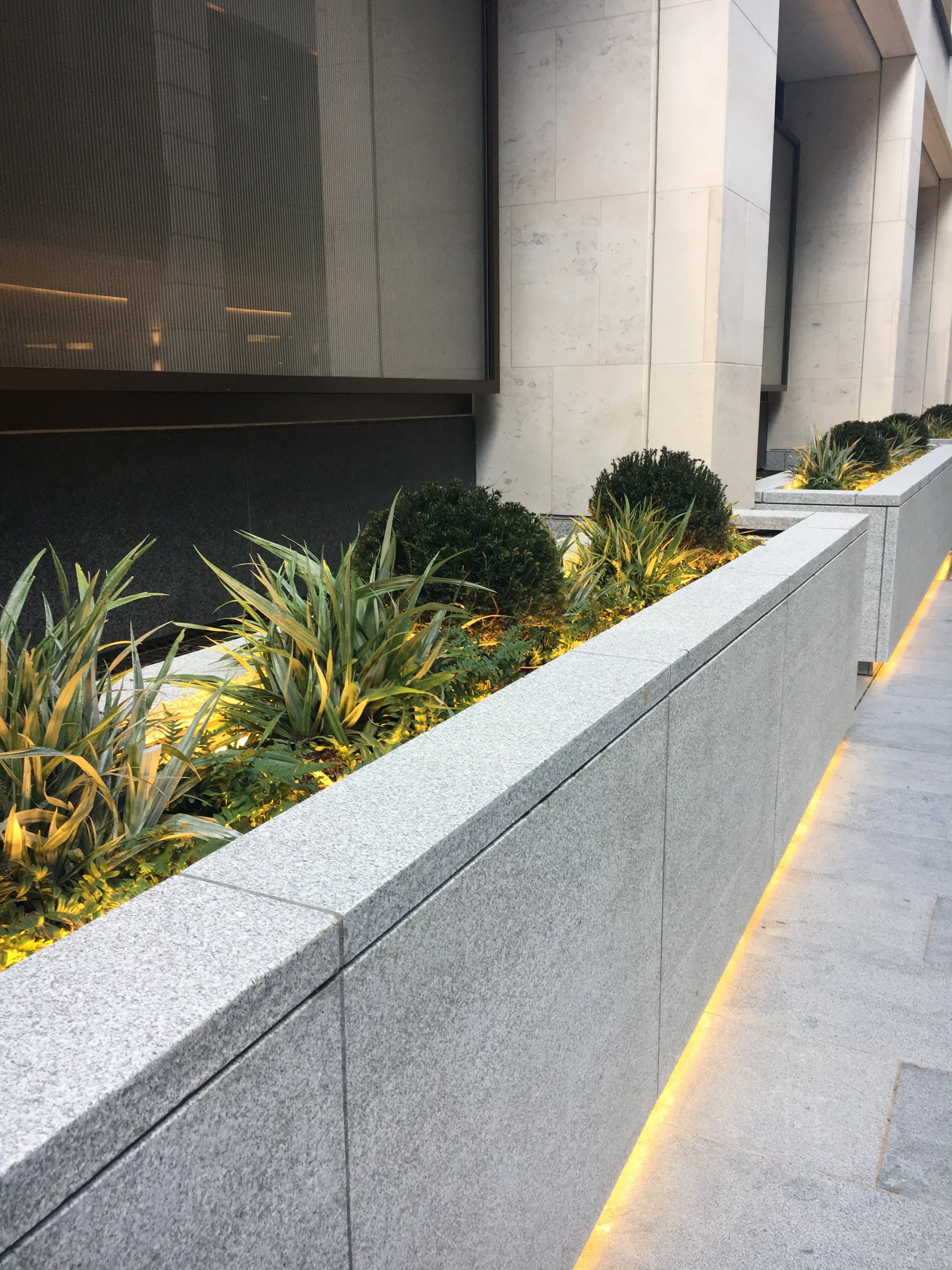 We designed and built the internal steel framework, using 8mm, 100mm x 100mm box-section hot-dipped galvanised steel. This massive structure provided the strength and rigidity needed to support the stone slabs, 25mm to 50mmm thick, which were hung and bonded on the sides. Delicate sheet-metal trim in bronze provided a smooth, seamless finish, and ensured the internal steelwork was completely invisible. As an additional challenge, we had to account for a slope at either end of the site: this meant angling the base, while keeping the top edge completely level.