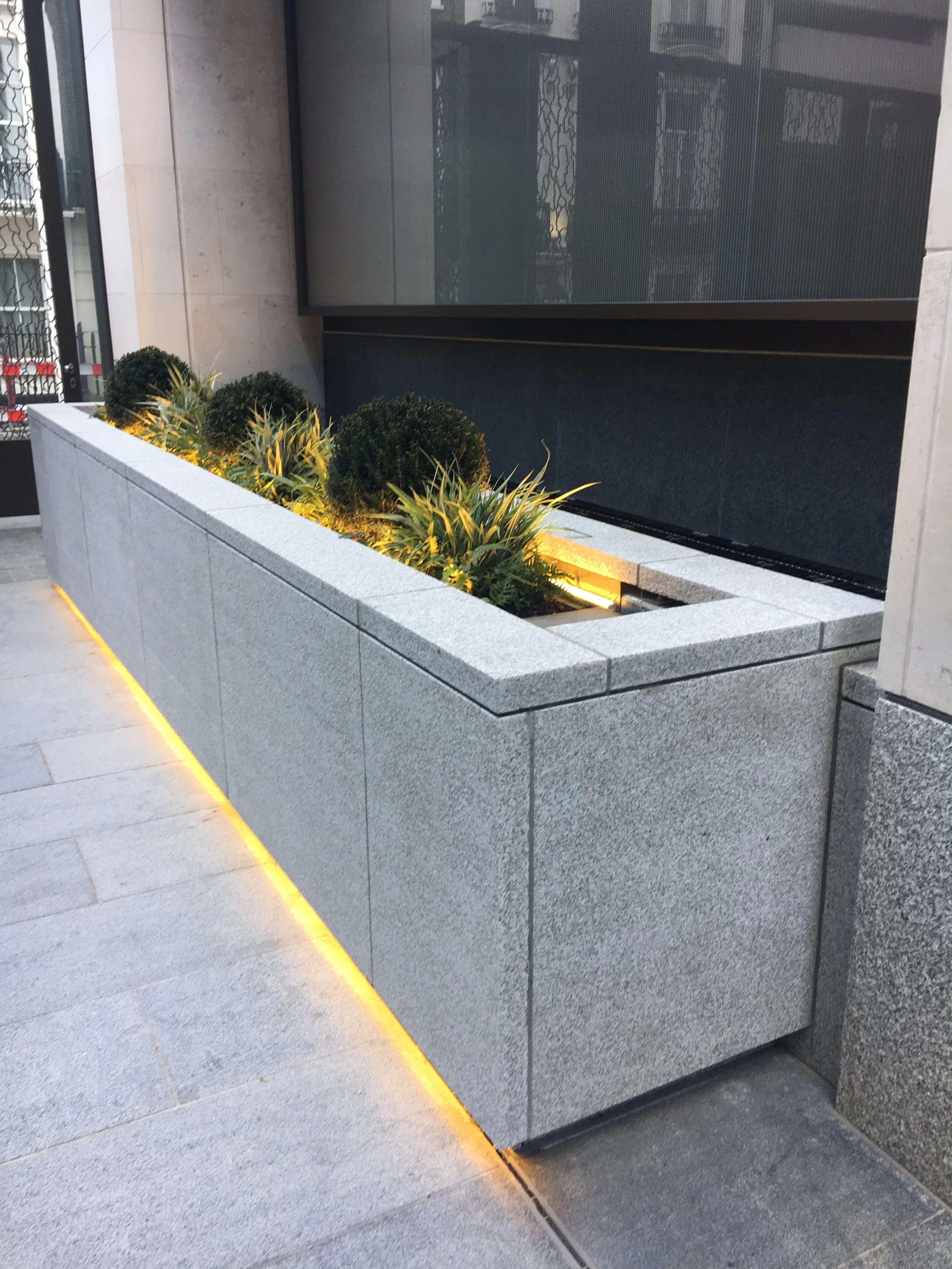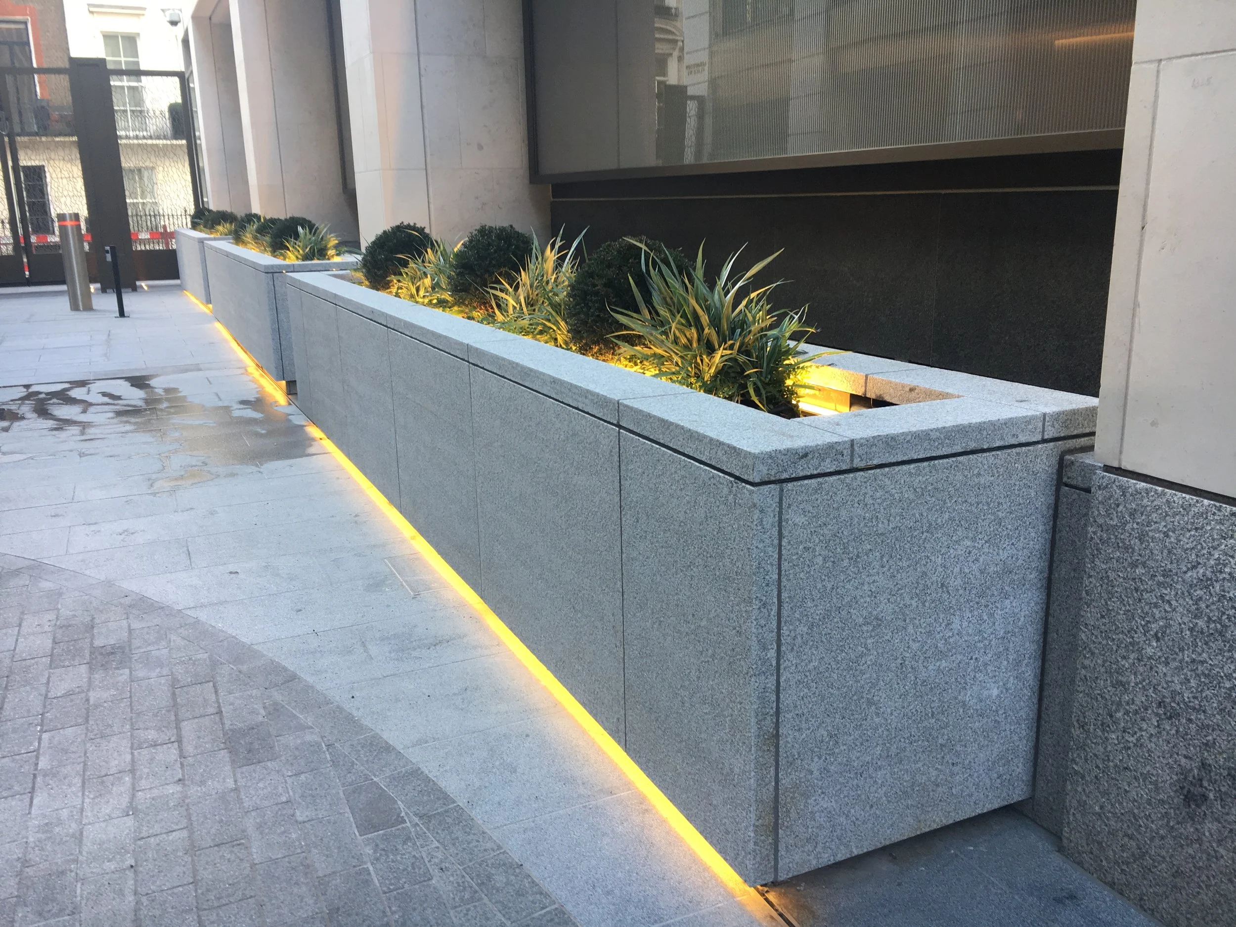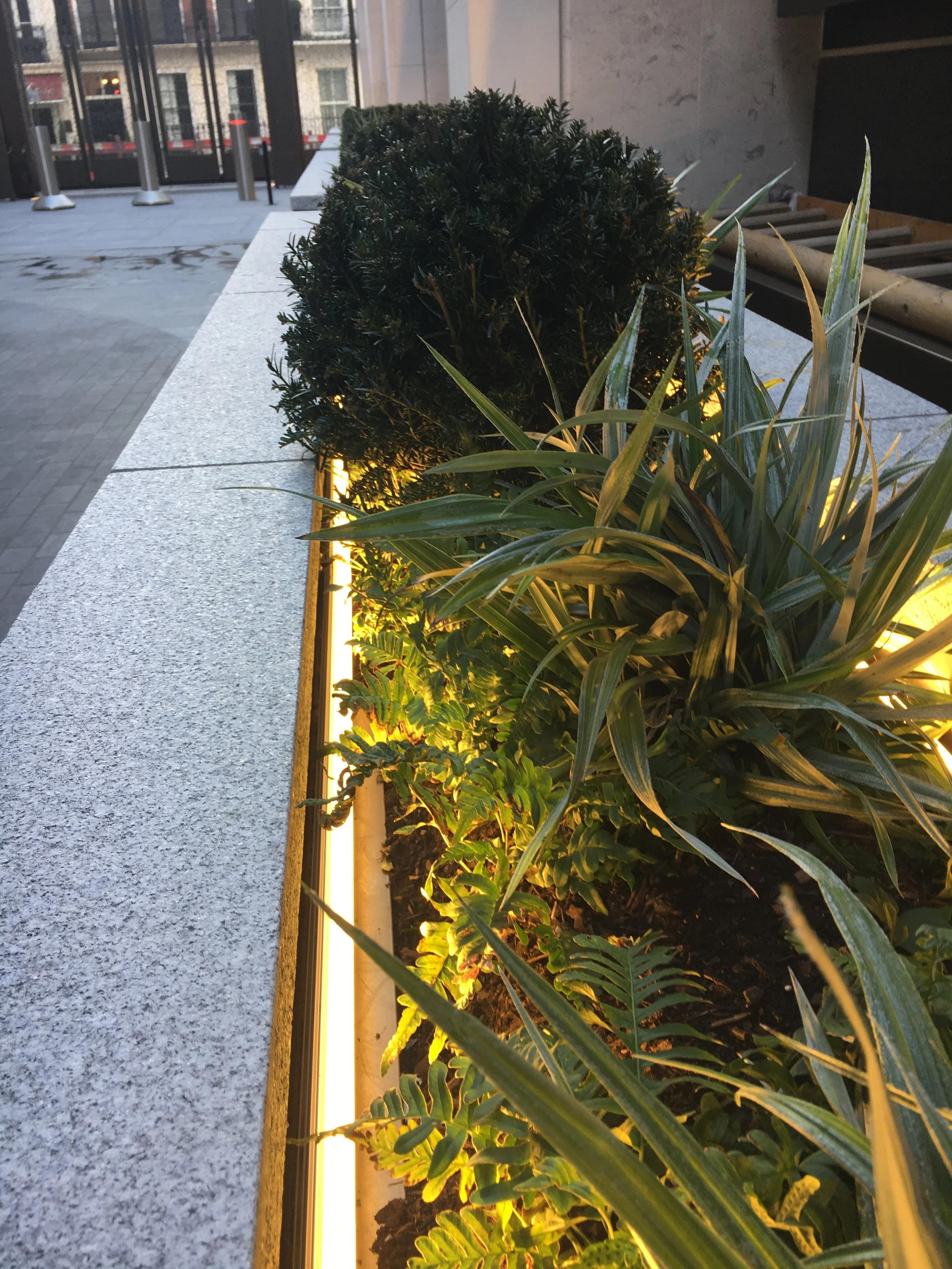 We also designed and made the powder-coated steel liners containing the plants: at each end of the planter is an IP-rated enclosure, one containing the drivers for the LED lighting strips, the other housing the irrigation system. Like so many of our projects, the deceptively simple outward appearance hides a multitude of details and complex engineering solutions.