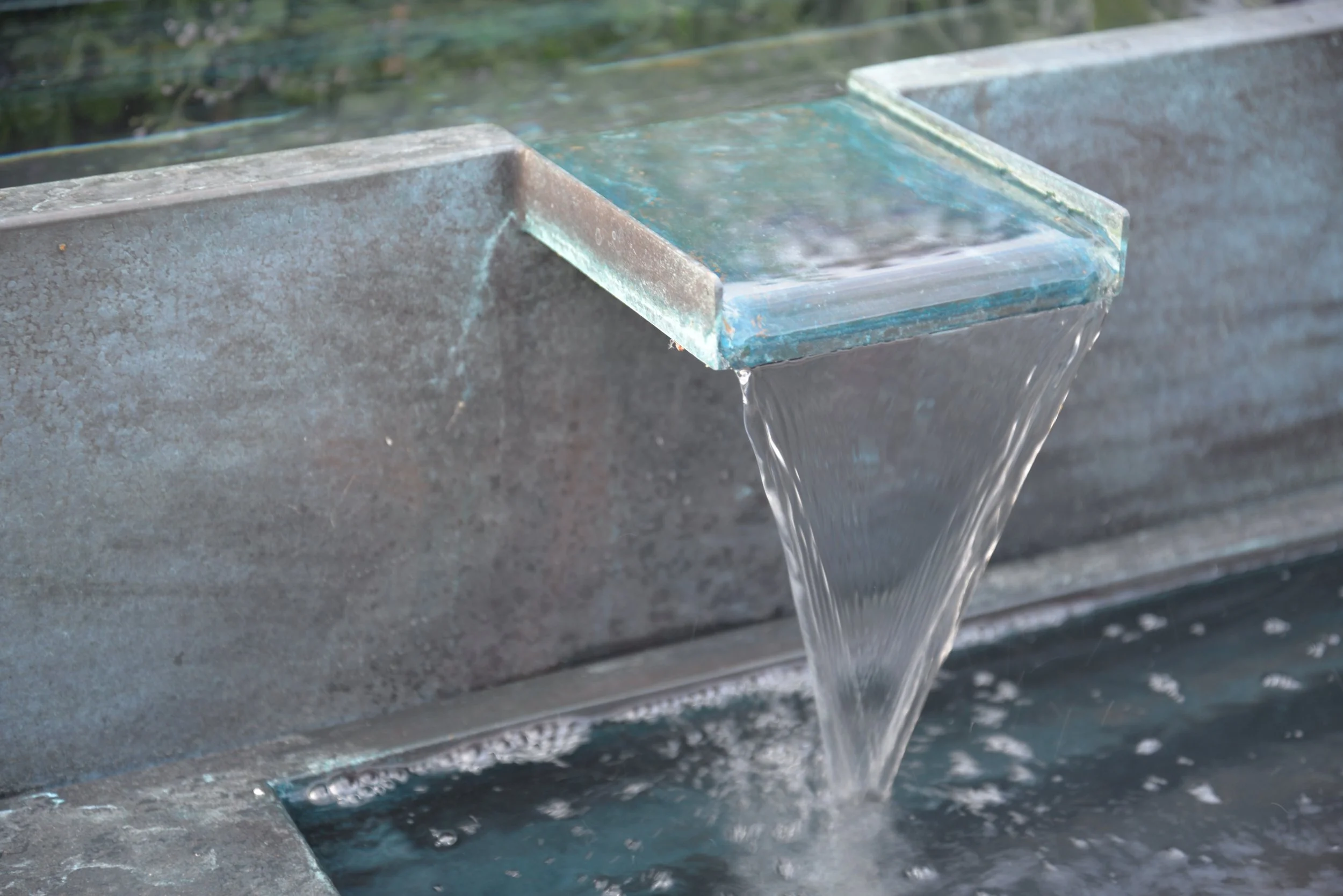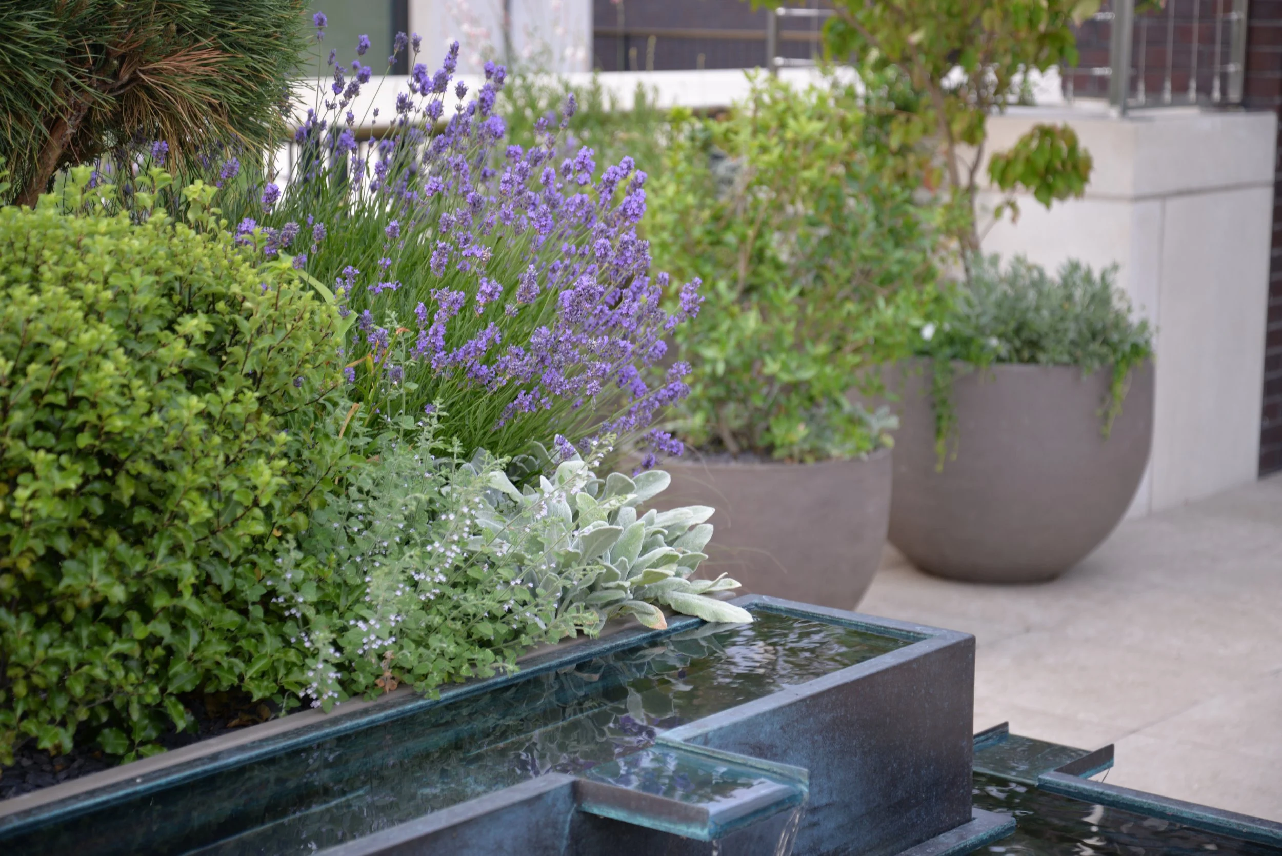 Tiered cascading water feature in patinated bronze for a newly constructed roof terrace in Central London designed by Emily Erlam and built by for Landform Consultants.
