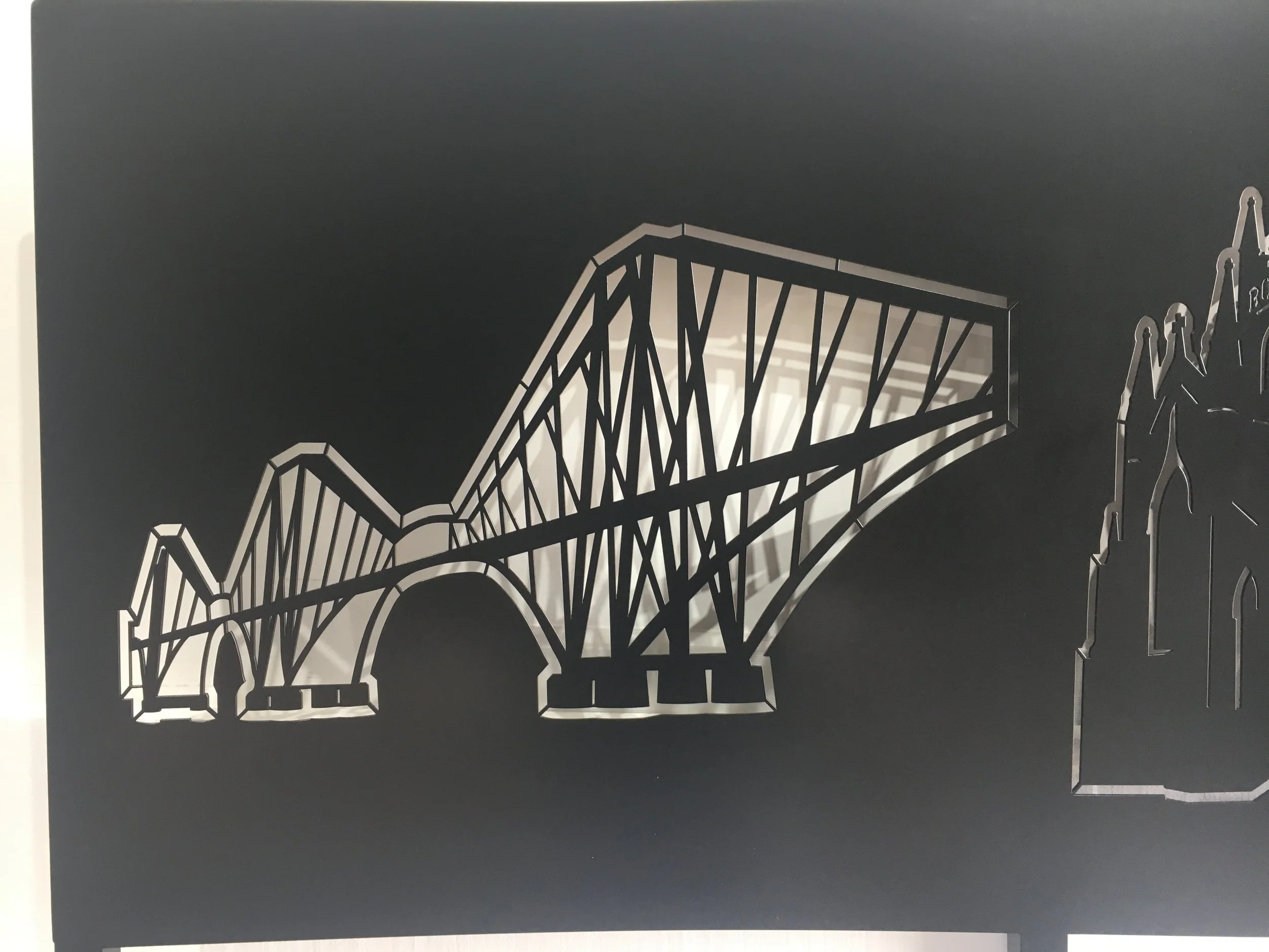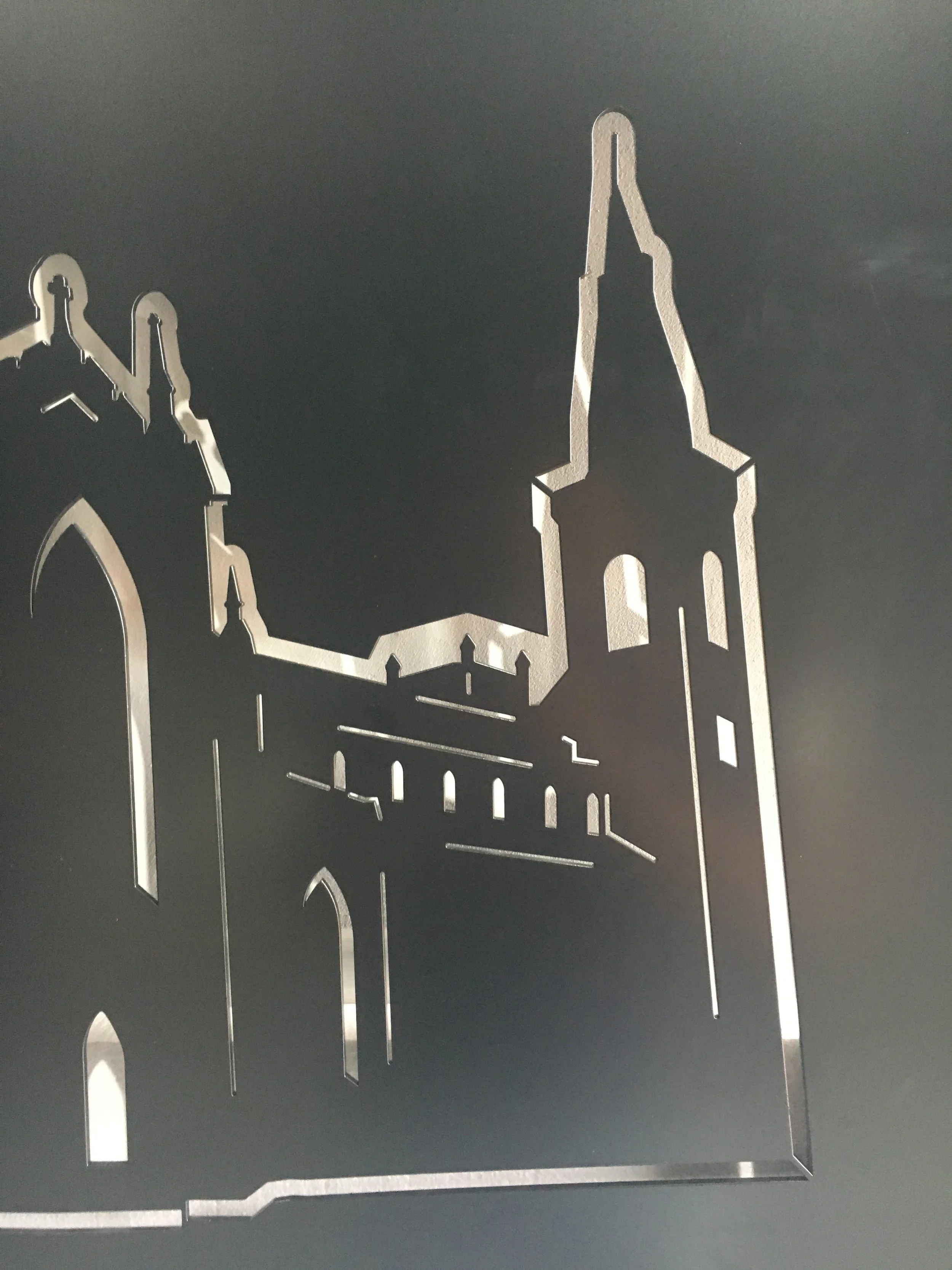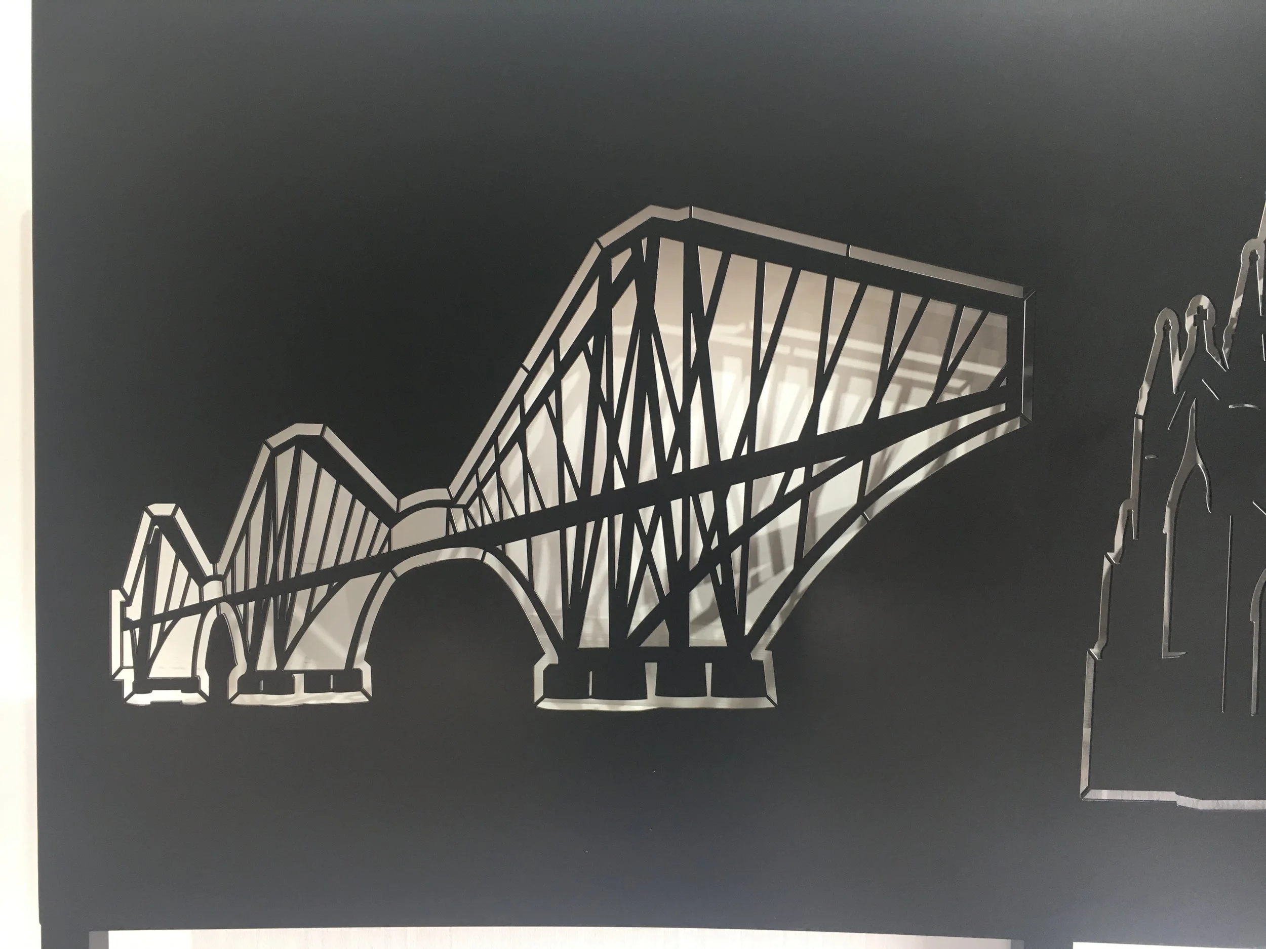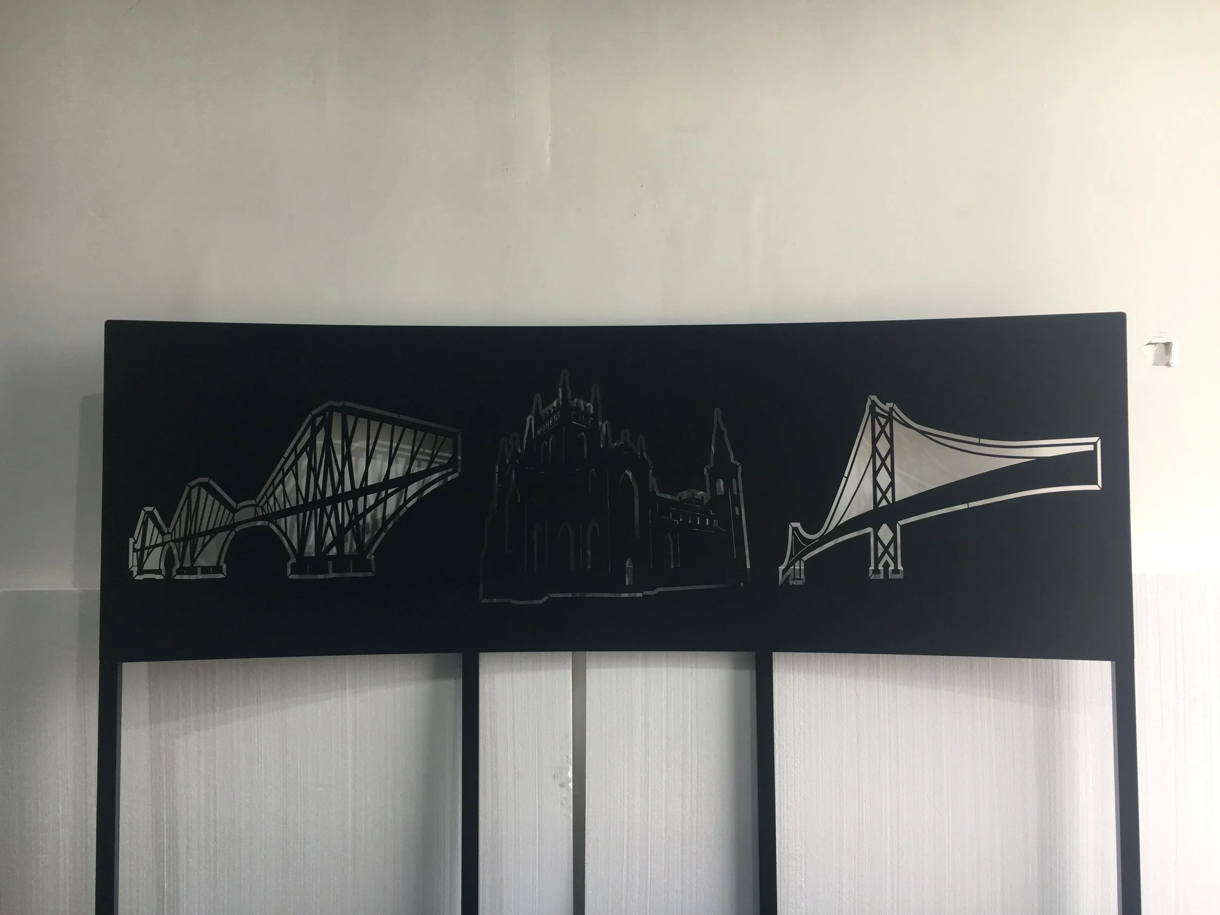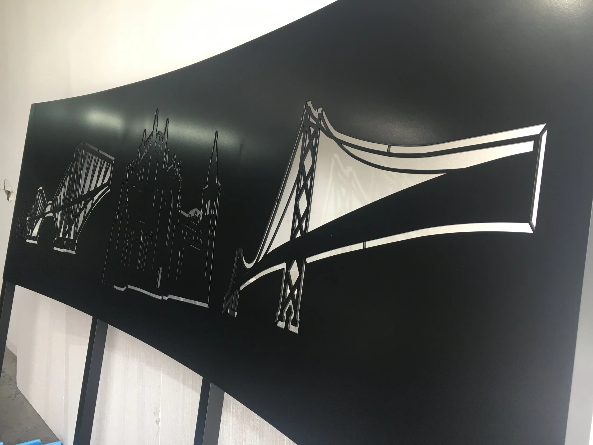 A curved decorative aluminium panel featuring laser-cut outlines of local landmarks to mark the customer’s 50th anniversary.