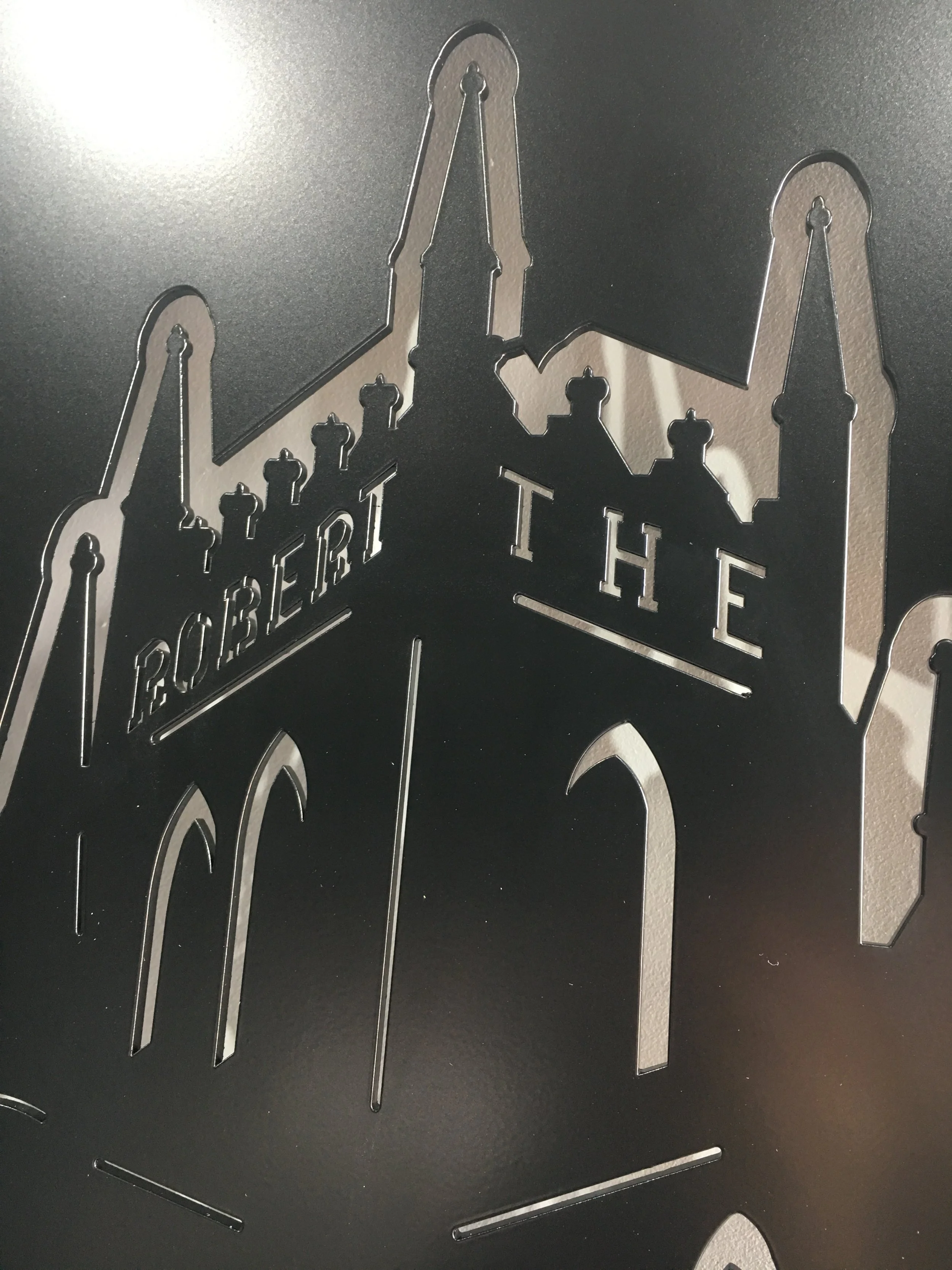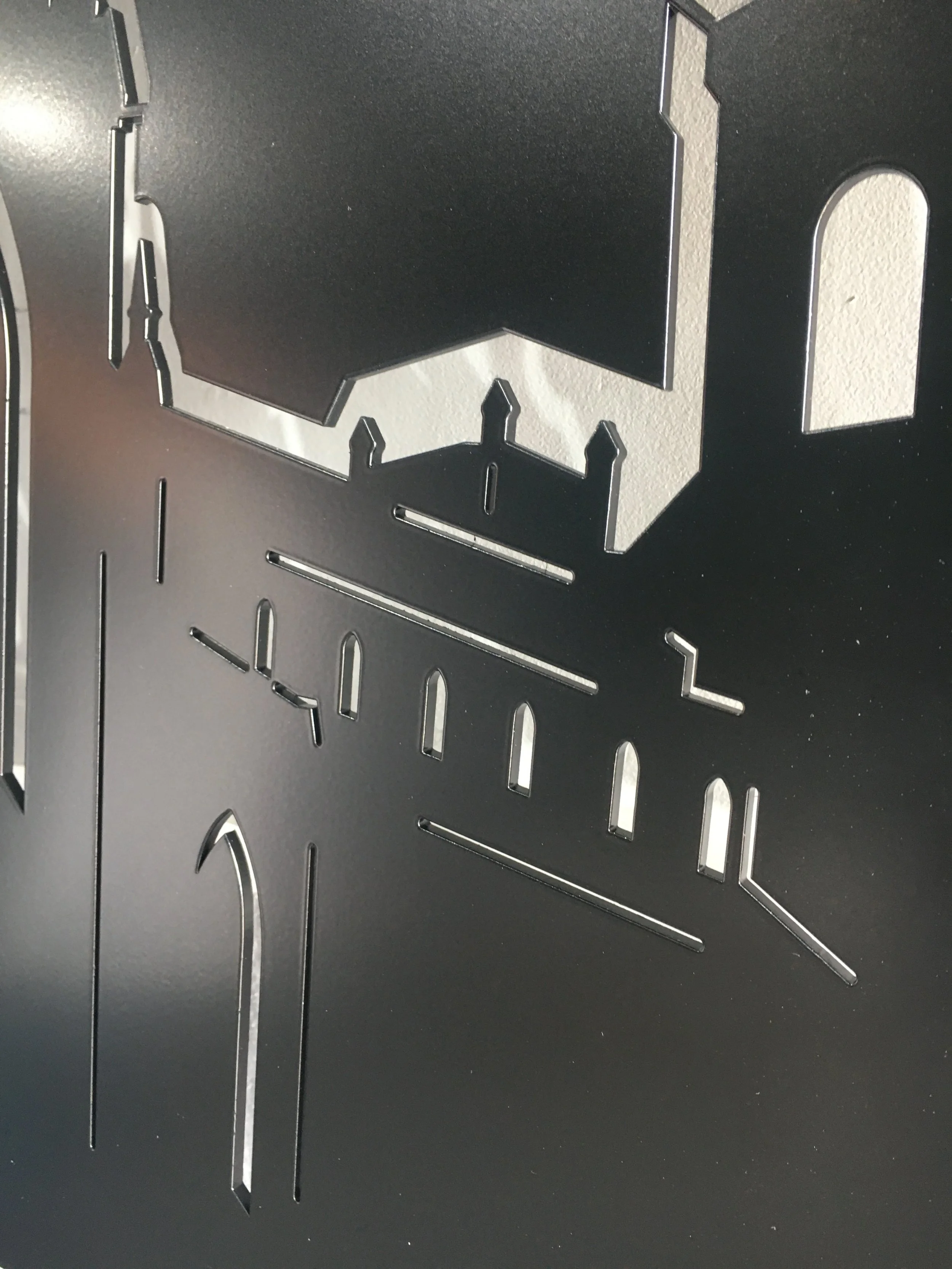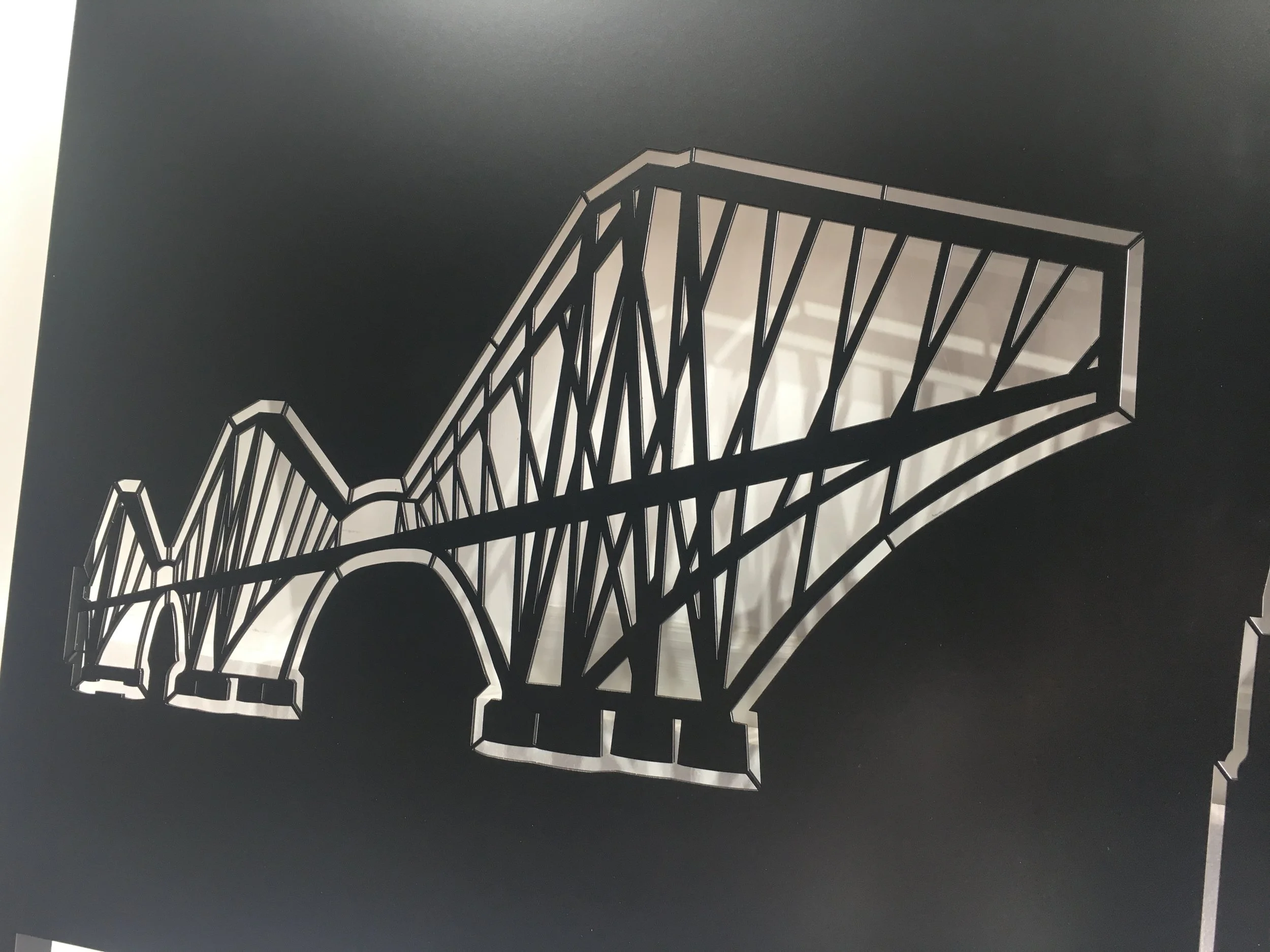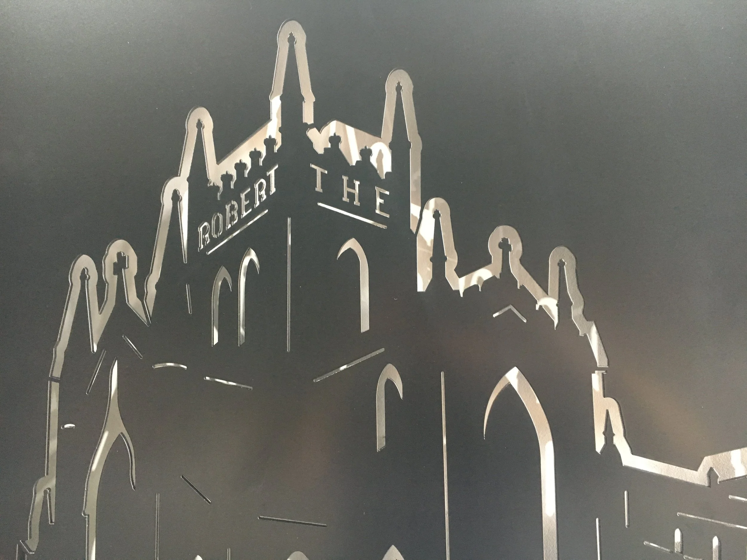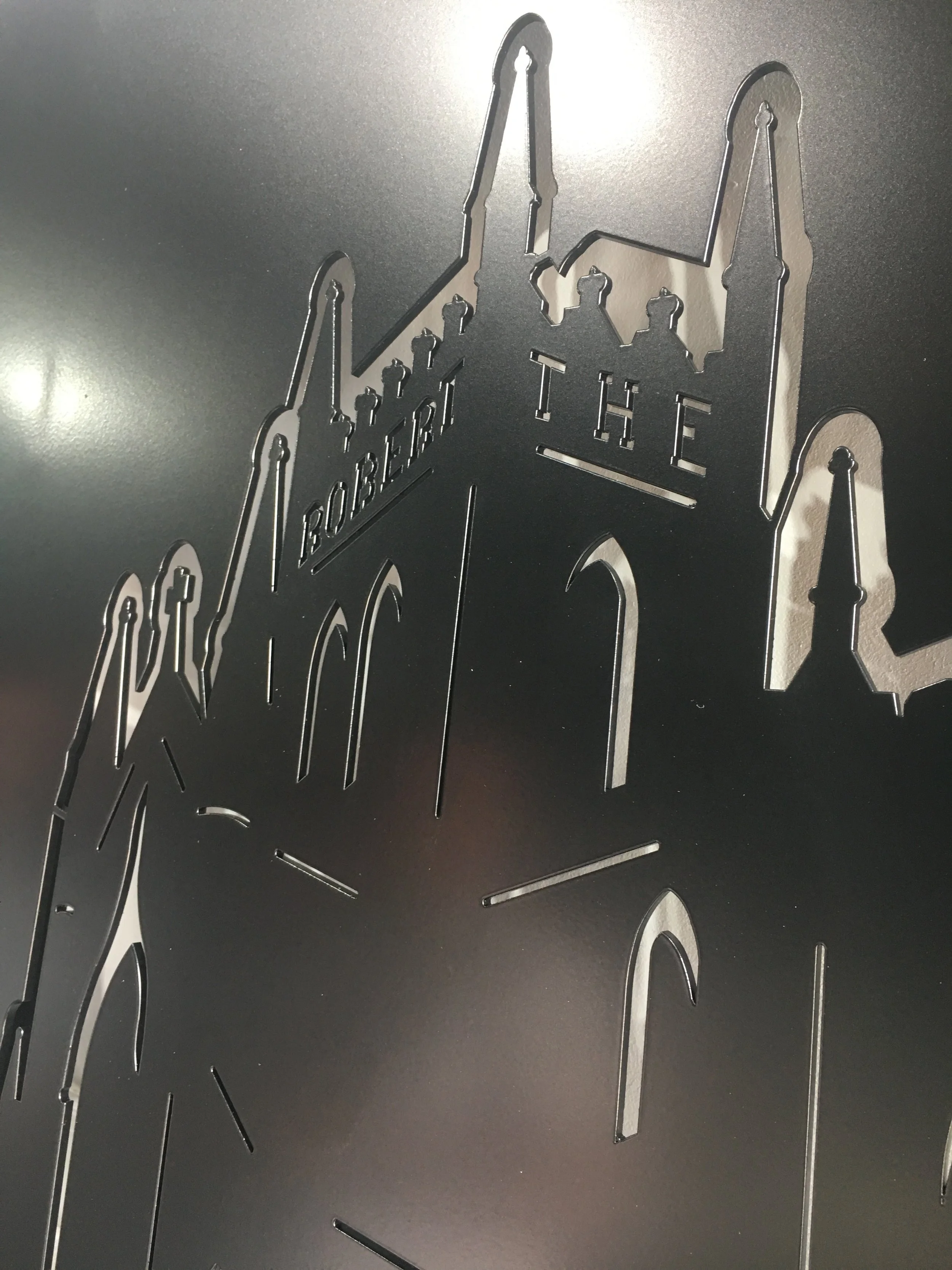 A curved decorative aluminium panel featuring laser-cut outlines of local landmarks to mark the customer’s 50th anniversary.
