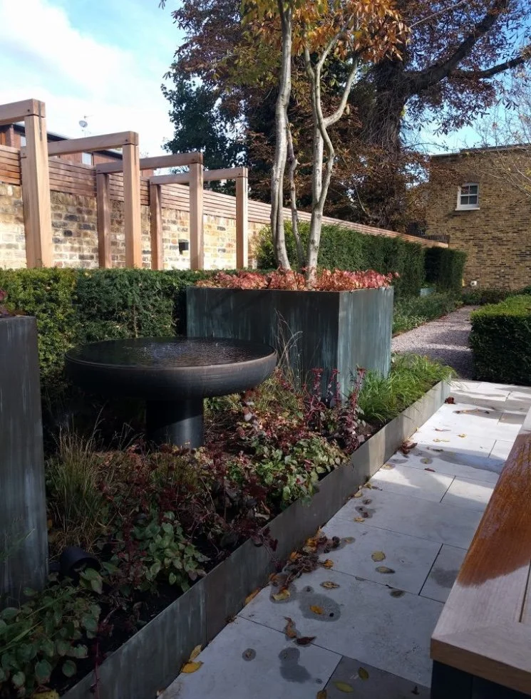Raised Landscape Edging with a Patinated Bronze Coating for this garden in the St John’s Wood area of London.