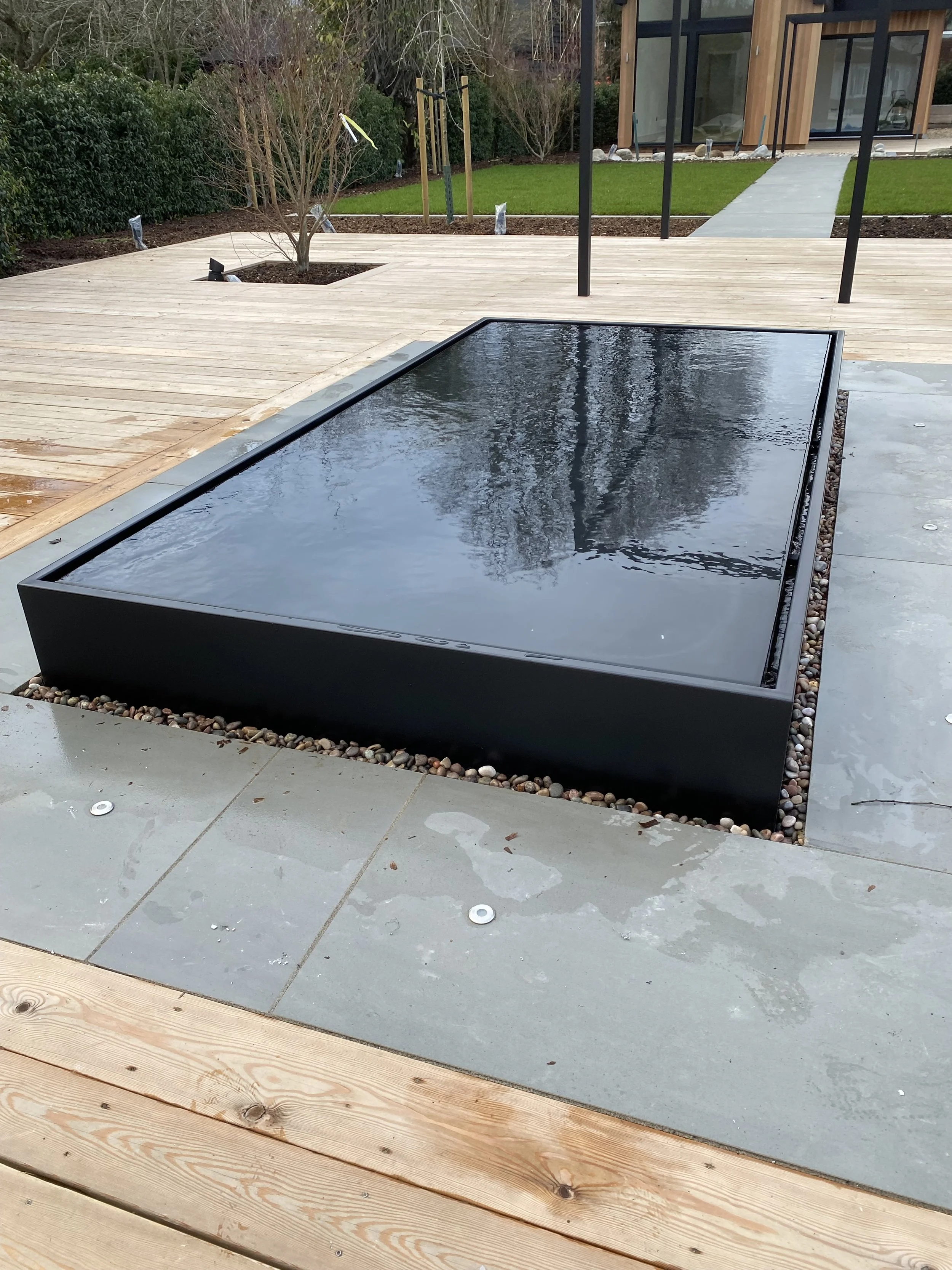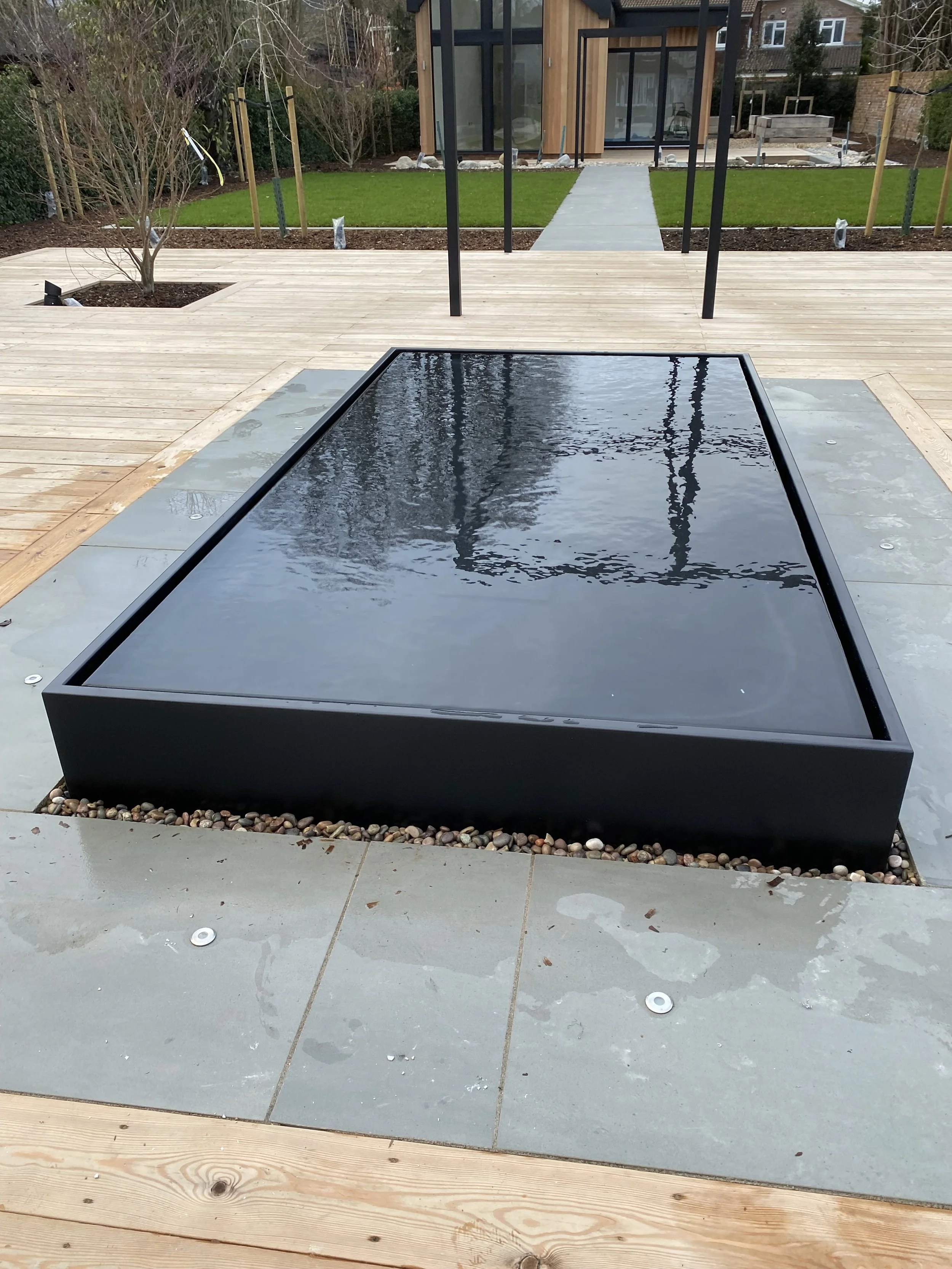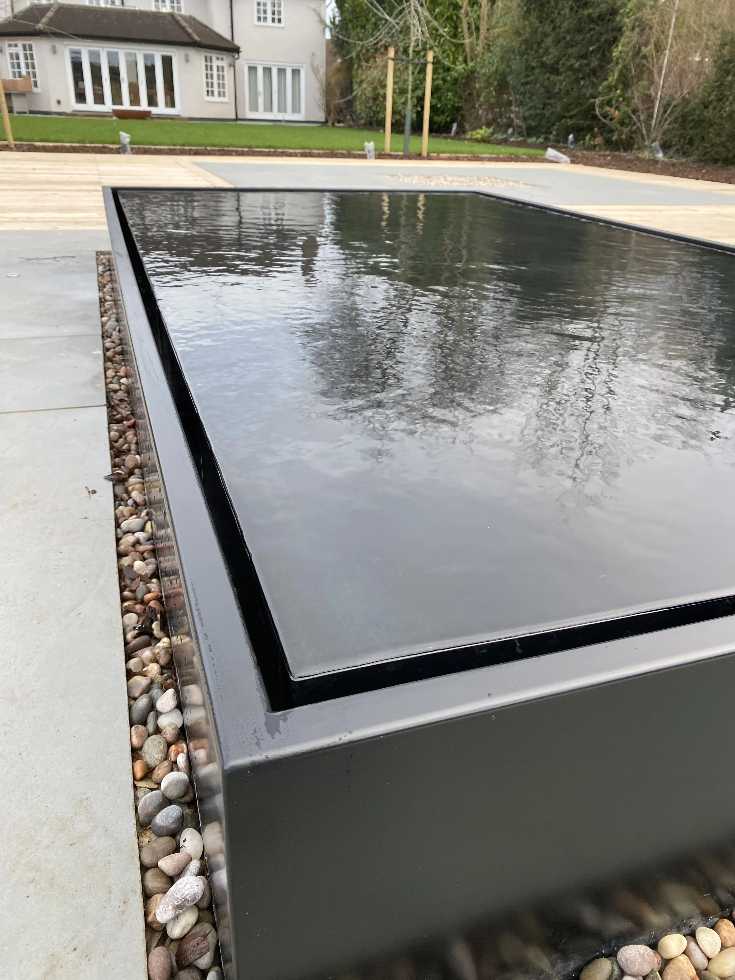 A collaboration with Green Tree Garden Design for a bespoke infinity water feature for a private residence in St Albans, Hertfordshire.