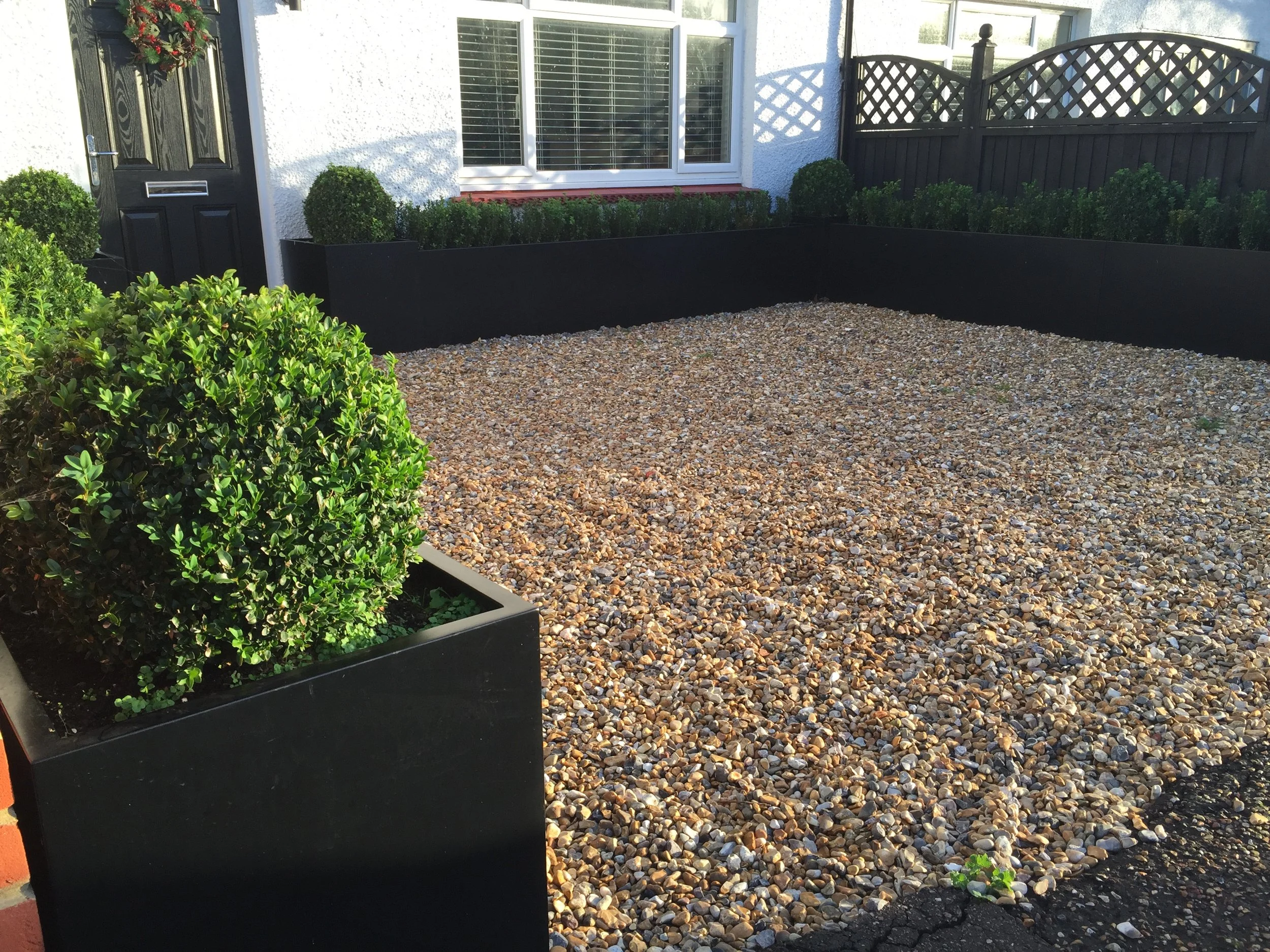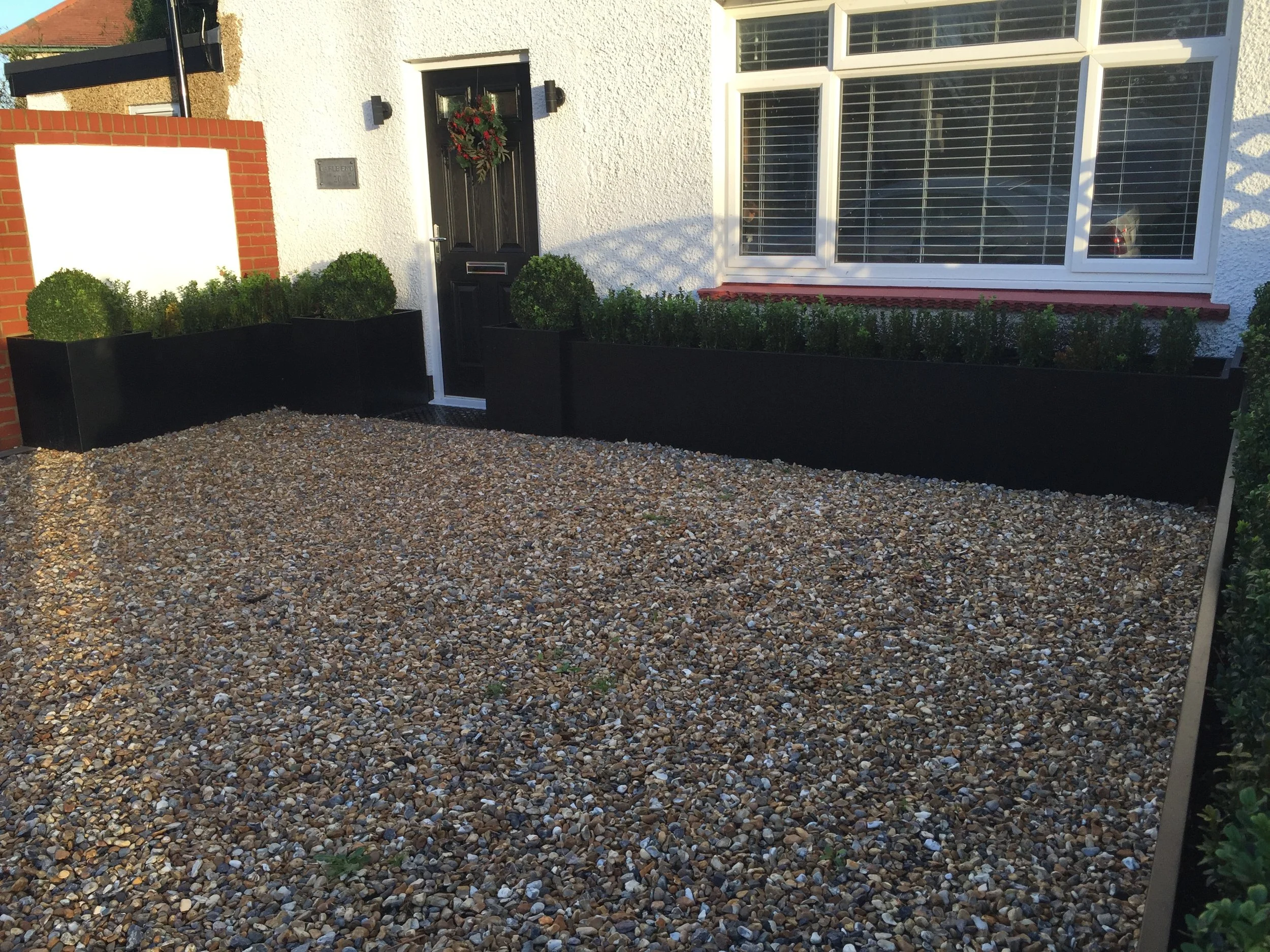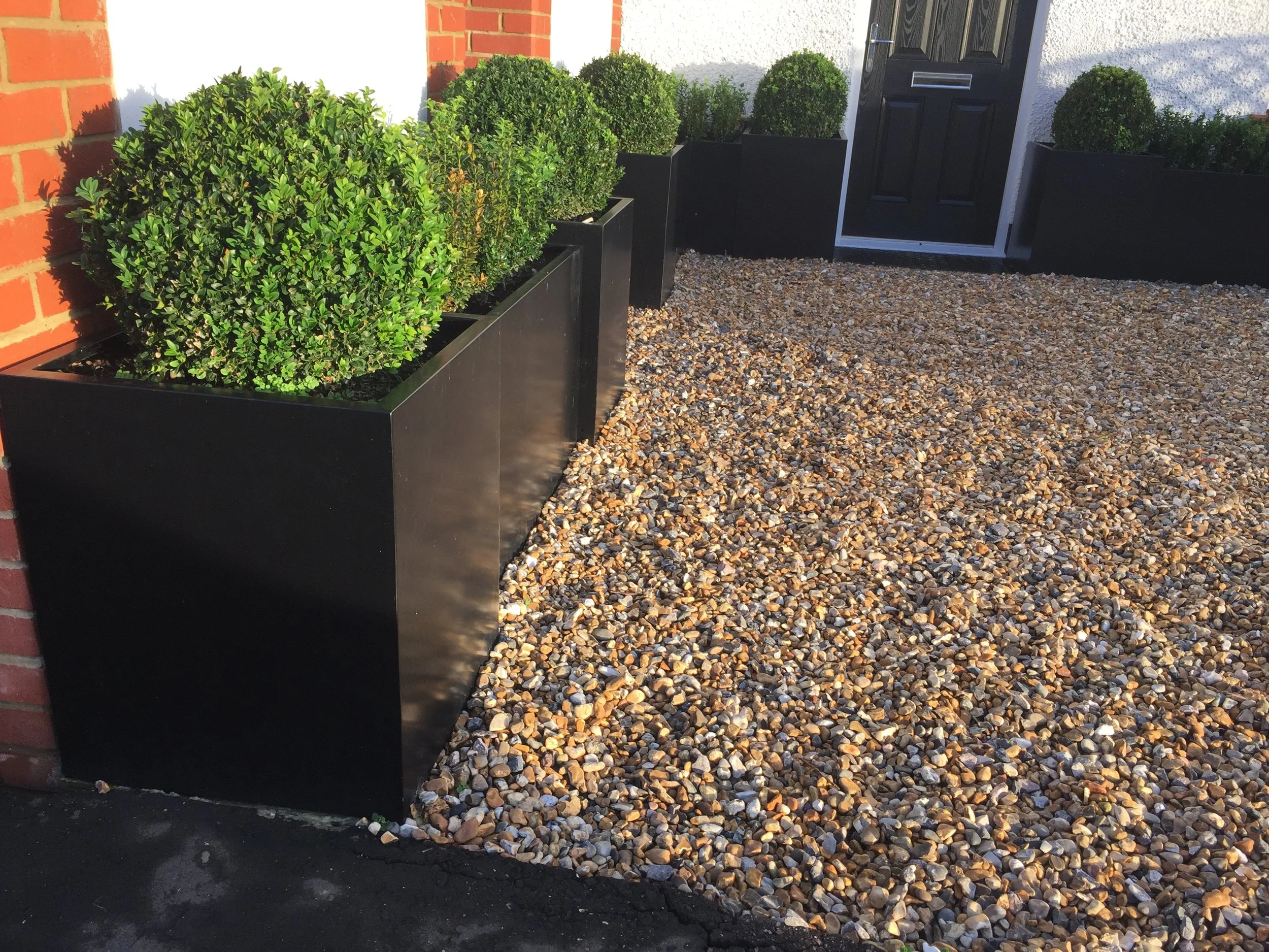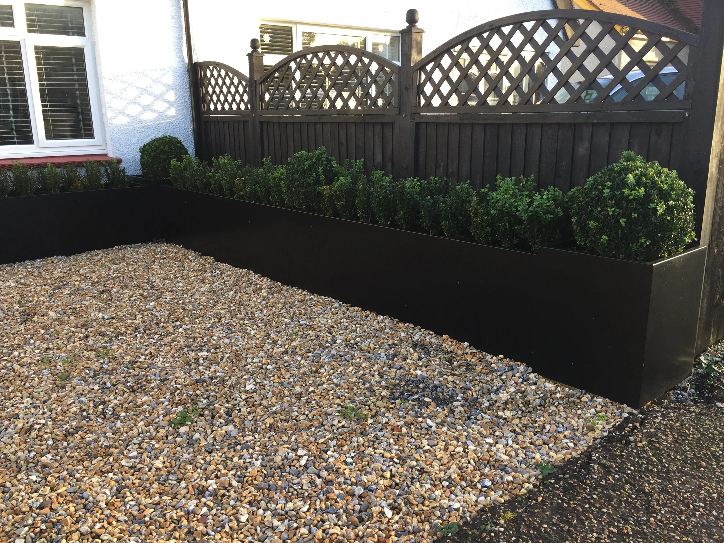 Modular bespoke planters with internal connections forming a planted perimeter to the front parking area of this residential property in Sussex.